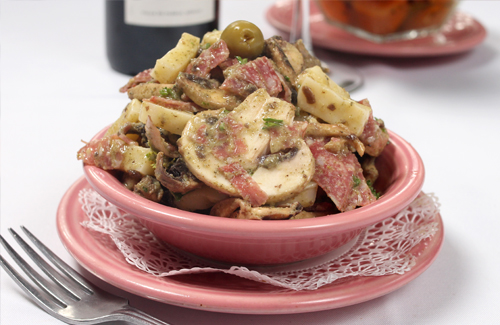 Con jamón serrano, salami, queso gruyère y aceitunas.